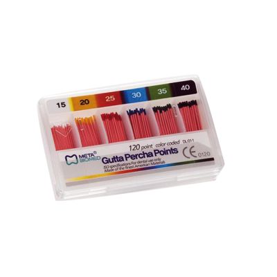 Cones de gutta-percha ISO et cones de papier assortis pour l'obturation canalaire et le séchage. Gutta standardisée ISO 15 à 140, cones papier pour l'aspiration de l'humidité résiduelle avant scellement.